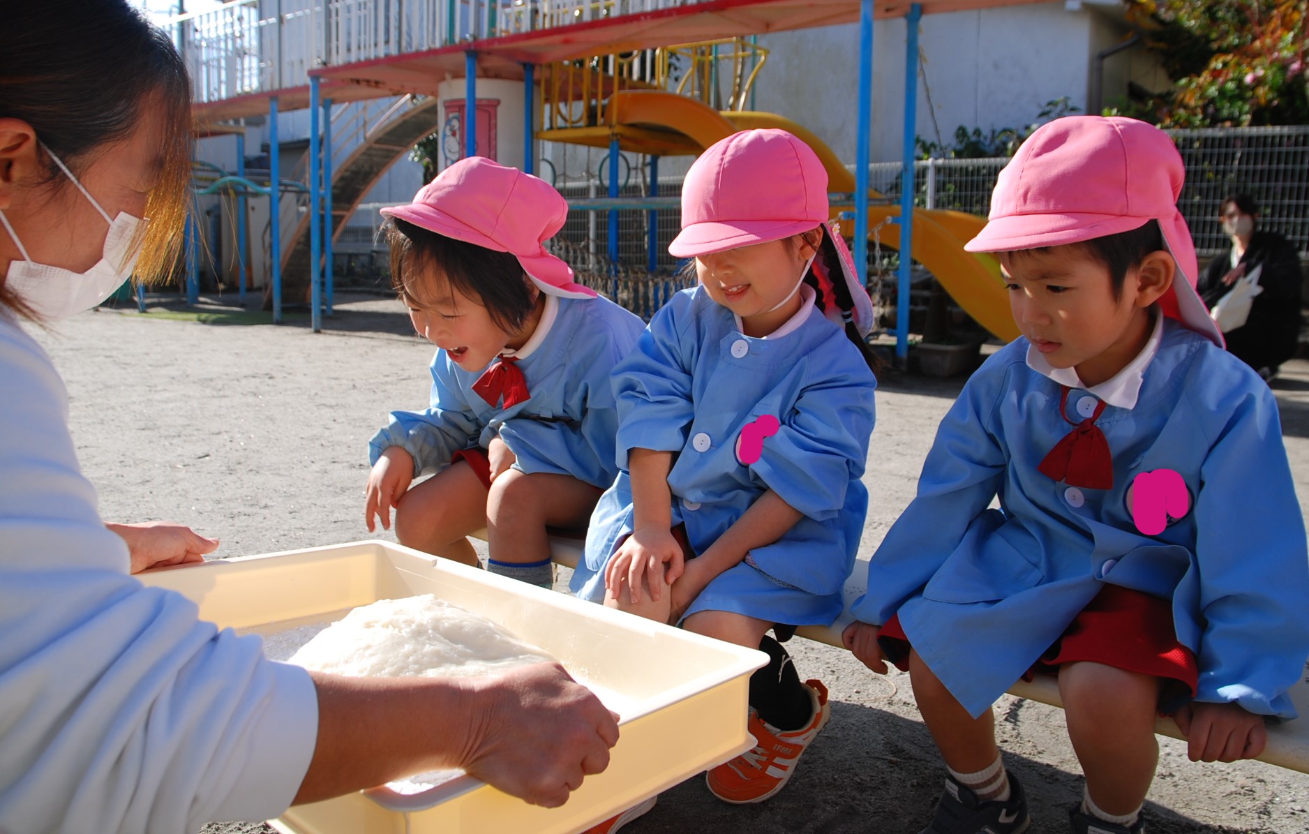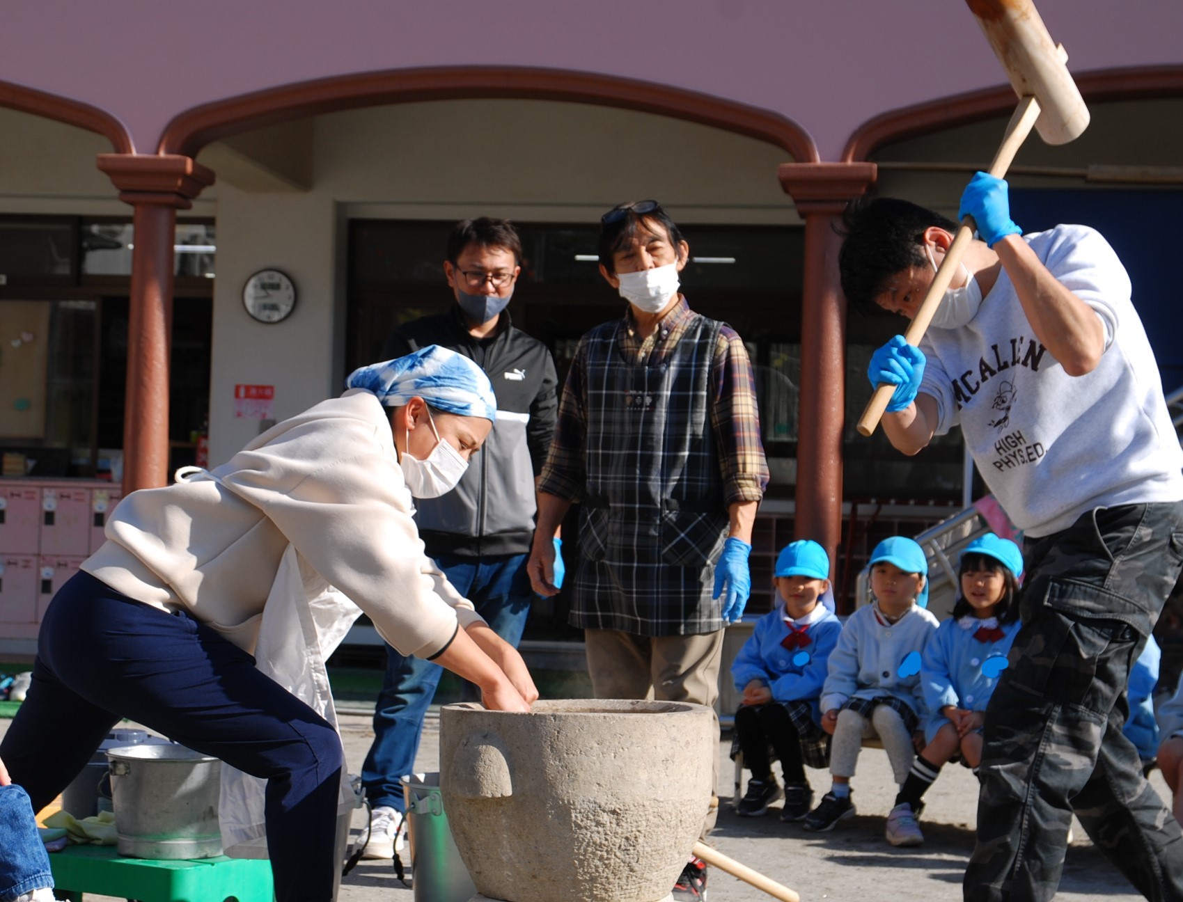 園長先生や父母の会の会長や副会長のお父様が、杵でつかれる度に、みんなで「よいしょ!よいしょ!」と元気な声でパワーを送り、石臼の中でお餅に変身✨していく姿を真剣にみつめていた子どもたち👀