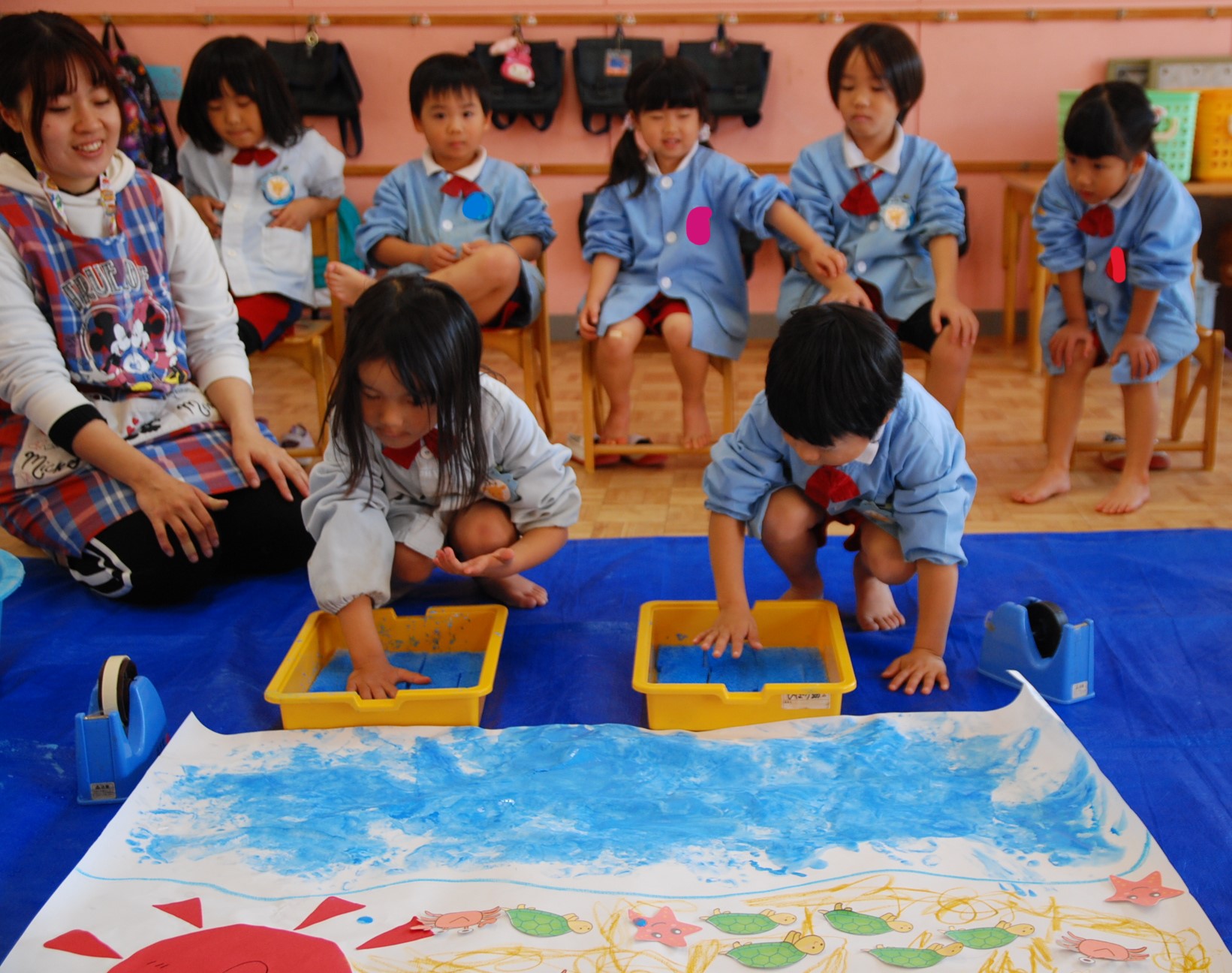 リズム室で、鉄棒や平均台などの道具を使った「体育あそび」をしたり、保育室で足型をとって「製作遊び」をしたり、保育室で色々な音楽を使った「おゆうぎ会ごっこ」をしたり、3グループに分かれて、3つの保育を行いました。